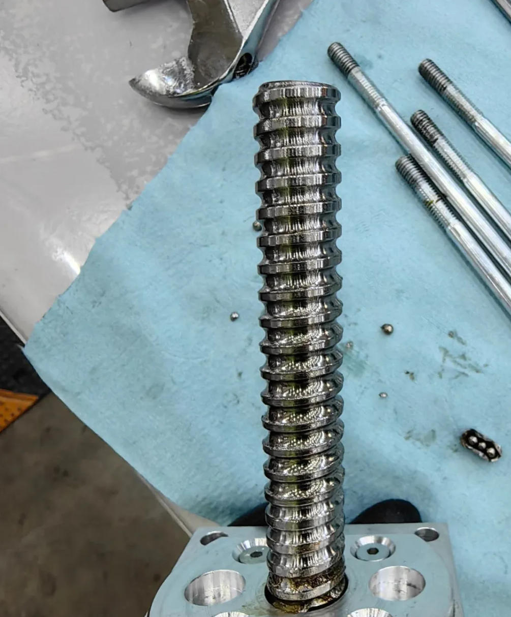 3.将定量缸拆下来,检查发现丝杆磨损,钢珠掉出来很多,还有钢珠磨损的情况,见下图:
