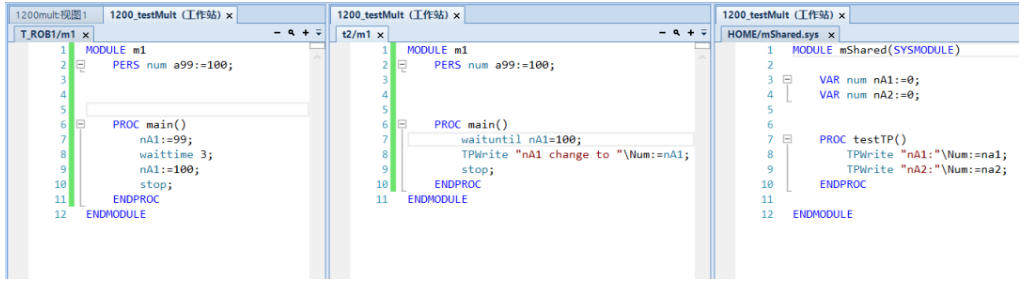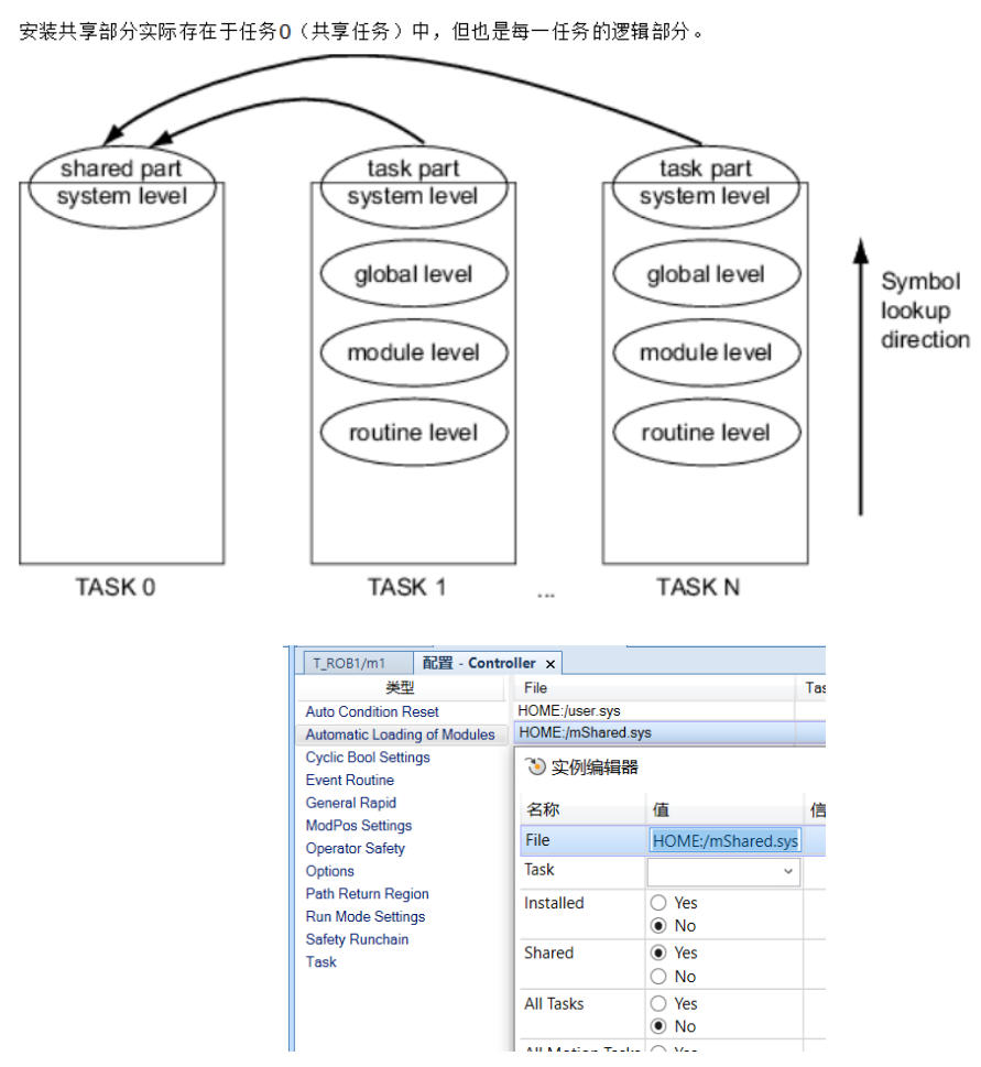 被设置为shared的模块,实质属于Task0,任何其他任务都可以调用,同时减少RAPID内存的消耗。shared模块内的数据不论pptomain等操作(即使var)也会一直保持数据,直到p启动操作才会重新设回初值。